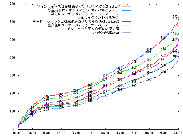 1位 627票 リインフォースII@魔法少女リリカルなのはStrikerS 2位 616票 翠星石@ローゼンメイデン オーベルテューレ 3位 534票 真紅@ローゼンメイデン オーベルテューレ 4位 502票 エルルゥ@うたわれるもの 5位 496票 キャロ・ル・ルシエ@魔法少女リリカルなのはStrikerS 6位 437票 金糸雀@ローゼンメイデン オーベルテューレ 7位 429票 アンリエッタ王女@ゼロの使い魔 8位 407票 水瀬秋子@Kanon ━━━━━ここまで本戦進出━━━━━ 9位 384票 閻魔あい@地獄少女 二籠 10位 334票 柚原このみ@OVA ToHeart2 11位 286票 黒井ななこ@らき☆すた 12位 256票 桜田のり@ローゼンメイデン オーベルテューレ 13位 206票 アーニャ@ネギま!? 14位 179票 桜野音羽@スカイガールズ 15位 176票 此花光莉@ストロベリー・パニック 16位 167票 茅原みのり@らき☆すた 17位 166票 エスメラルダ@Saint October 18位 160票 ラヴィニア・リベルス@奏光のストレイン 18位 160票 絡繰茶々丸@ネギま!? 20位 145票 モンモランシー・マルガリタ・ラ・フェール・ド・モンモランシ@ゼロの使い魔 21位 142票 高良ゆかり@らき☆すた 22位 141票 佐倉紗絵@sola 23位 140票 ミサキ・シズノ(三崎紫雫乃)@ZEGAPAIN 24位 135票 律子・キューベル・ケッテンクラート@くじびきアンバランス 25位 134票 ミア・クレメンティス@夜明け前より瑠璃色な Crescent Love 25位 134票 北条比奈@らぶドル 〜Lovely Idol〜 27位 132票 蟹沢きぬ@つよきす Cool×Sweet 28位 131票 紺野真琴@時をかける少女 29位 128票 西澤桃華@ケロロ軍曹 シリーズ 30位 120票 天羽雅音@ウィッチブレイド 31位 109票 呂蒙子明@一騎当千 〜Dragon Destiny〜 32位 108票 テンコ@神様家族 ━━━━ここまで2次予選進出━━━━ 33位 104票 ミコト@うたわれるもの 33位 104票 バルサ@精霊の守り人 35位 103票 マイメロディ(マイメロ)@おねがいマイメロディ シリーズ 36位 102票 深峰莉子@Gift 〜ギフト〜 eternal rainbow 37位 93票 日下部みさお@らき☆すた 38位 90票 涼宮遙@あゆまゆ劇場 39位 75票 遠山和葉@名探偵コナン 40位 73票 シルフィード@ゼロの使い魔 41位 70票 ローズ・アンダーソン(リタ・レヴァント)@SoltyRei 42位 69票 六条宮穂@この青空に約束を- 〜ようこそつぐみ寮へ〜 43位 62票 足来真琴(音神亜里沙)@ちょこッとSister 43位 62票 音無小夜@BLOOD+ 45位 59票 ツスクル@ふしぎ星の☆ふたご姫Gyu! 46位 58票 毒島華花@武装錬金 47位 56票 ワルキューレ@円盤皇女ワるきゅーレ 時と夢と銀河の宴 48位 48票 リーズ・ハリエット・メイヤー@RED GARDEN 49位 47票 ライラ@Venus Versus Virus 50位 46票 アルト・クラエッタ@魔法少女リリカルなのはStrikerS 51位 45票 キョンの妹の友達(ショートボブ)@涼宮ハルヒの憂鬱 51位 45票 ノーヴェ@魔法少女リリカルなのはStrikerS 53位 44票 キョンの妹の友達(ポニーテール)@涼宮ハルヒの憂鬱 54位 42票 小田原絵里子(オダエリ)@ちょこッとSister 55位 41票 有沢竜貴(たつき)@BLEACH 56位 39票 ワラゲピンク@Master of Epic The Animation Age 57位 36票 西崎紀子@つよきす Cool×Sweet 58位 34票 ミレーヌ・ホフマン(009-1)@009-1 58位 34票 越後屋銀子@貧乏姉妹物語 58位 34票 マルダシ(マル)@xxxHOLiC 61位 30票 お観世(幽霊少女)@ケロロ軍曹 62位 29票 みたらしアンコ@NARUTO -ナルト- 63位 27票 ぬりかべの嫁@ゲゲゲの鬼太郎 64位 26票 アリス・ゲーハビッチ@爆丸 -バトルブローラーズ- 65位 24票 胡蝶ひばり@桃華月憚 65位 24票 向日塔子@ストラトス・フォー アドヴァンス 完結編 65位 24票 穂波たまえ(たまちゃん)@ちびまる子ちゃん 68位 23票 香陽(御堂香陽)@桃華月憚 68位 23票 ピュリア・リチャードソン@ガイキング LEGEND OF DAIKU-MARYU 70位 22票 田尾真紀(演劇部部長)@がくえんゆーとぴあ まなびストレート! 70位 22票 こずえ@京四郎と永遠の空 70位 22票 白川明日菜@桃華月憚 70位 22票 しばわんこ@しばわんこの和のこころ 74位 20票 まりあ@ウィッチブレイド 75位 19票 リオ・メイロン@スーパーロボット大戦OG 〜ディバイン・ウォーズ〜 75位 19票 白浜さおり(ケンイチの母)@史上最強の弟子 ケンイチ 77位 18票 シャーロット・E・イェーガー@ストライクウィッチーズ 78位 17票 ユキ@怪物王女 78位 17票 シズネ@NARUTO -ナルト- シリーズ 78位 17票 葛城ミミコ@BLACK BLOOD BROTHERS 81位 16票 安原蛍@アイドルマスター XENOGLOSSIA 81位 16票 アユ@ハヤテのごとく! 83位 15票 大佛かほる@かしまし 〜ガール・ミーツ・ガール〜 84位 14票 ジャミル・カエラ@ウエルベールの物語 〜Sisters of Wellber〜 84位 14票 XVのカプセルの中の女の子@魔法少女リリカルなのはStrikerS 84位 14票 許チョ仲康@一騎当千 〜Dragon Destiny〜 87位 13票 星野奈津江@この青空に約束を- 〜ようこそつぐみ寮へ〜 87位 13票 リリス@Venus Versus Virus 87位 13票 チュー@Master of Epic The Animation Age 87位 13票 しーちゃん@アニマル横町 87位 13票 ルーファ・ワルトゥムシカ・トロイス@神曲奏界ポリフォニカ 87位 13票 バコ@おねがいマイメロディ シリーズ 93位 12票 楽進文謙@一騎当千 〜Dragon Destiny〜 93位 12票 ミス・ゴールデンウィーク@ONE PIECE 95位 11票 メッシスの食堂のおばちゃんたち@シムーン 95位 11票 真田幸村@MUSASHI-GUN道- 95位 11票 カリナ@地球へ… 95位 11票 ミミコちゃん@錬