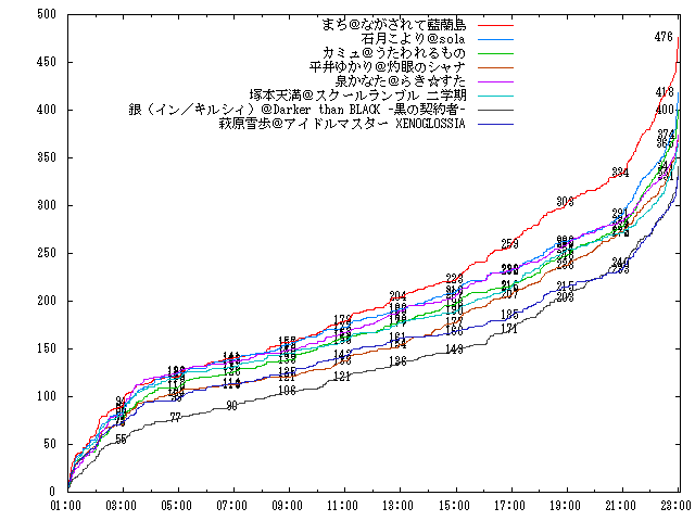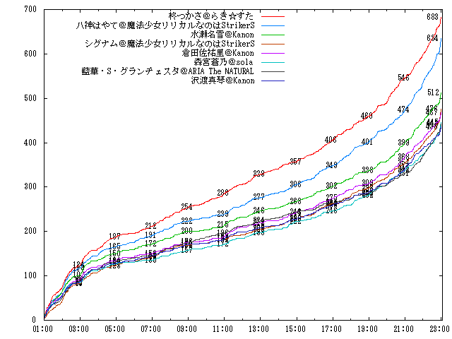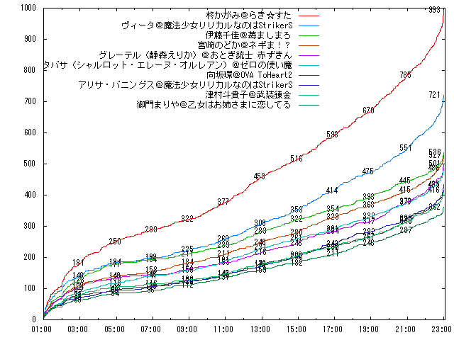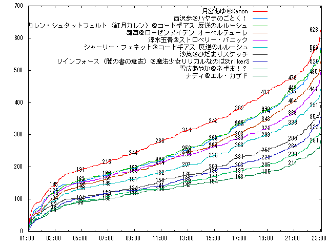 1位 683票 柊つかさ@らき☆すた 2位 634票 八神はやて@魔法少女リリカルなのはStrikerS 3位 512票 水瀬名雪@Kanon 4位 476票 シグナム@魔法少女リリカルなのはStrikerS 5位 467票 倉田佐祐里@Kanon 6位 445票 森宮蒼乃@sola 7位 443票 藍華・S・グランチェスタ@ARIA The NATURAL 8位 436票 沢渡真琴@Kanon ━━━━━ここまで本戦進出━━━━━ 9位 354票 巻@瀬戸の花嫁 9位 354票 天宮学美(まなび)@がくえんゆーとぴあ まなびストレート! 11位 317票 小鳥桃葉(もも)@がくえんゆーとぴあ まなびストレート! 12位 303票 アテナ・グローリー@ARIA The NATURAL 13位 188票 遠山佳代@ひとひら 14位 174票 名橋ルチア@Venus Versus Virus 15位 163票 鉄子@錬金3級まじかる?ぽか〜ん 16位 150票 明石裕奈@ネギま!? 17位 145票 プチ・キャラット(ぷちこ)@ウィンターガーデン 18位 142票 リースリット・ノエル@夜明け前より瑠璃色な Crescent Love 19位 133票 サクラ@ツバサ・クロニクル シリーズ 20位 120票 大野加奈子@げんしけん 21位 108票 神楽まりえ@となグラ! 22位 105票 鳴滝史伽@ネギま!? 23位 103票 笹森花梨@OVA ToHeart2 24位 102票 ドロシー@MAR-メルヘヴン- 24位 102票 ユリッペ@FNS地球特捜隊ダイバスター 26位 99票 三浦あずさ@アイドルマスター XENOGLOSSIA 27位 93票 源静香@ドラえもん 28位 90票 鈴風小夜(トゥルーデ/シルフィーヌ)@おとぎ銃士 赤ずきん 29位 84票 クレア・フォレスト@RED GARDEN 30位 83票 フラノ@いぬかみっ! 31位 80票 志村妙@銀魂 32位 77票 シェリー@ウエルベールの物語 〜Sisters of Wellber〜 32位 77票 姉ヶ崎妙@スクールランブル 二学期 ━━━━ここまで2次予選進出━━━━ 34位 74票 チャチャゼロ@ネギま!? 35位 69票 リタ・シオール@ウエルベールの物語 〜Sisters of Wellber〜 36位 68票 藤村静@この青空に約束を- 〜ようこそつぐみ寮へ〜 37位 57票 賈ク文和@一騎当千 〜Dragon Destiny〜 37位 57票 朝比奈みくるのコスプレをした女の子@らき☆すた 37位 57票 矢村双葉@ぼくらの 40位 53票 いぐさ@いぬかみっ! 41位 52票 岩倉砂沙美@砂沙美☆魔法少女クラブ シーズン2 42位 51票 張飛益徳@一騎当千 〜Dragon Destiny〜 43位 50票 深澤ゆき@Over Drive 43位 50票 藤宮千紗@Gift 〜ギフト〜 eternal rainbow 45位 48票 ラルク・メルク・マール@トップをねらえ2! 46位 42票 卯月アリス@すもももももも 〜地上最強のヨメ〜 46位 42票 原田理花@ハチミツとクローバーII 48位 41票 ホウメイ@シャイニング・ティアーズ×ウィンド 48位 41票 ヴューラ@シムーン 50位 39票 シルヴィア・ド・アリシア@創星のアクエリオン−裏切りの翼− 51位 35票 玉野まゆ@あゆまゆ劇場 52位 34票 貧ちゃん(貧乏神)@おじゃる丸 53位 33票 苺原桃子@ラブゲッCHU ミラクル声優白書 54位 32票 ゼクティ・ツヴァイ@シャイニング・ティアーズ×ウィンド 55位 31票 芙蓉紅葉@SHUFFLE! MEMORIES 56位 30票 倉賀野百華@桜蘭高校ホスト部 57位 26票 デネヴ@CLAYMORE 57位 26票 高峰司@砂沙美☆魔法少女クラブ シーズン2 57位 26票 ハヴォック@Darker than BLACK -黒の契約者- 60位 25票 真海エリ@AIKa R-16:VIRGIN MISSION 60位 25票 葦原かんな(カンナ)@電脳コイル 62位 24票 間宮リナ@ひぐらしのなく頃に 63位 23票 エーリ女王@スクールランブル 二学期 63位 23票 ユーリカ@桃華月憚 65位 22票 ルルゥ@BLOOD+ 66位 21票 城戸円@スクールランブル 二学期 66位 21票 小森久美子@神様家族 68位 20票 蘇峰玲奈@ウィッチブレイド 69位 18票 小林恵@N・H・Kにようこそ! 69位 18票 藤原章子@少年陰陽師 71位 17票 リリ@おとぎ銃士 赤ずきん 71位 17票 VIIIのカプセルの中の女の子@魔法少女リリカルなのはStrikerS 71位 17票 ミラノ=エントラシア@MURDER PRINCESS 71位 17票 三雲音々@Venus Versus Virus 75位 15票 ラヴ江@増田こうすけ劇場 ギャグマンガ日和 第2弾 75位 15票 野口笑子@ちびまる子ちゃん 75位 15票 御厨ラン@ストラトス・フォー アドヴァンス 完結編 78位 14票 ジューン@コヨーテ ラグタイムショー 78位 14票 小野寺翼@ラブゲッCHU ミラクル声優白書 78位 14票 碧乃玲@REIDEEN 78位 14票 大塚真由@Darker than BLACK -黒の契約者- 82位 13票 神代神名@機神大戦 ギガンティック・フォーミュラ 82位 13票 リリーナ・ノルシュタイン@デジモンセイバーズ 84位 12票 ぼんげぼんげ(キャサリン)@ネギま!? 84位 12票 スワン@ふしぎ星の☆ふたご姫Gyu! 86位 11票 スネ夫のママ@ドラえもん 86位 11票 西田奈津美@ときめきメモリアル Only Love 86位 11票 さくらすみれ(おかあさん)@ちびまる子ちゃん 86位 11票 カトリーヌ前川@アニマル横町 90位 10票 かおり@ながされて藍蘭島 91位 9票 柊海@つよきす Cool×Sweet 91位 9票 食堂のおばさん(妹)@らき☆すた 91位 9票 ローナ・ファウナ@ザ・サード 〜蒼い瞳の少女 91位 9票 豊川狐@天保異聞 妖奇士 91位 9票 フィラ・マリーク@ザ・サード 〜蒼い瞳の少女 91位 9票 阿音@銀魂 91位 9票 ナスターシャ(ナターリア)@エル・カザド 91位 9票 シャンイン(グラス・ハート)@エンジェル・ハート 91位 9票 花屋のおばさん@電脳コイル 100位 8票 ラブ@オシャレ魔女 ラブandベリー/しあわせのまほう 100位 8票 潘玉玲@蒼天の拳 100位 8票 エミリア@ロミオ×ジュリエット 100位 8票 磯貝由香@あさっての方向。 100位 8票 ソフトボール部員(
