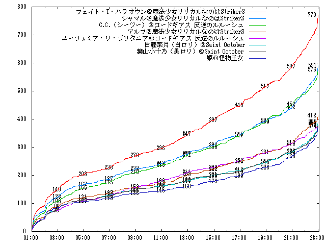 1位 770票 フェイト・T・ハラオウン@魔法少女リリカルなのはStrikerS 2位 591票 シャマル@魔法少女リリカルなのはStrikerS 3位 576票 C.C.(シーツー)@コードギアス 反逆のルルーシュ 4位 412票 アルフ@魔法少女リリカルなのはStrikerS 5位 390票 ユーフェミア・リ・ブリタニア@コードギアス 反逆のルルーシュ 6位 387票 白藤菜月(白ロリ)@Saint October 7位 378票 葉山小十乃(黒ロリ)@Saint October 8位 374票 姫@怪物王女 ━━━━━ここまで本戦進出━━━━━ 9位 360票 薔薇水晶@ローゼンメイデン オーベルテューレ 10位 277票 来栖とまり@かしまし 〜ガール・ミーツ・ガール〜 11位 229票 和泉亜子@ネギま!? 12位 218票 せつな@京四郎と永遠の空 13位 190票 宝積寺れんげ@桜蘭高校ホスト部 14位 186票 小日向すもも@はぴねす! 15位 183票 姫百合珊瑚@OVA ToHeart2 16位 172票 花園静馬@ストロベリー・パニック 17位 160票 ネヴィリル@シムーン 18位 157票 リザ・ワイルドマン@怪物王女 19位 142票 フロエ@シムーン 20位 138票 セーラ・ウィーレック@奏光のストレイン 21位 135票 ビビン@ふしぎ星の☆ふたご姫Gyu! 22位 129票 椎名桜子@ネギま!? 23位 128票 春日部咲@げんしけん 24位 127票 まぁ(まぁ社長)@ARIA The NATURAL 25位 121票 羽山海己@この青空に約束を- 〜ようこそつぐみ寮へ〜 26位 120票 磯川ニーナ@となグラ! 26位 120票 野々宮舞@らぶドル 〜Lovely Idol〜 28位 119票 ディアネイラ・イ・ライシャ・アルトリア・オル・ユーノス@ヒロイック・エイジ 28位 119票 四葉五月@ネギま!? 30位 117票 ごきょうや@いぬかみっ! 30位 117票 夢野琴@おねがいマイメロディ シリーズ 32位 108票 虎金井天々@すもももももも 〜地上最強のヨメ〜 ━━━━ここまで2次予選進出━━━━ 33位 107票 マリアンヌ・ヴィ・ブリタニア@コードギアス 反逆のルルーシュ 33位 107票 涼宮茜@あゆまゆ劇場 35位 104票 猫谷海羽@らぶドル 〜Lovely Idol〜 36位 98票 クスハ・ミズハ@スーパーロボット大戦OG 〜ディバイン・ウォーズ〜 36位 98票 高根美智子@乙女はお姉さまに恋してる 38位 95票 ステラ・ルーシェ@機動戦士ガンダムSEED C.E.73 -STARGAZER 39位 86票 篠崎咲世子@コードギアス 反逆のルルーシュ 40位 84票 桐島沙衣里@この青空に約束を- 〜ようこそつぐみ寮へ〜 41位 83票 佐藤良美@つよきす Cool×Sweet 42位 76票 狩野水穂@ストロベリー・パニック 43位 75票 エルザ@機神咆吼デモンベイン 44位 69票 ハルカ@ポケットモンスター アドバンスジェネレーション 45位 63票 ヴァイレ@キスダム -ENGAGE planet- 46位 62票 築山三奈子@マリア様がみてる OVA 47位 54票 メイウー@ZEGAPAIN 48位 53票 流姫那由乃@キスダム -ENGAGE planet- 49位 52票 エリス・L・マルヴィン@パンプキン・シザーズ 50位 51票 峰不二子@ルパン三世 セブンデイズラプソディ 51位 50票 たしぎ@ONE PIECE 52位 44票 仙堂ナナ@爆球HIT! クラッシュビーダマン 53位 43票 ロザリー・クローデル@舞−乙HiME Zwei 54位 42票 ヒメジ@ひまわりっ!! 55位 41票 隠岐清@妖逆門 55位 41票 VIIのカプセルの中の女の子@魔法少女リリカルなのはStrikerS 57位 39票 田中ぴゅん@大魔法峠 57位 39票 野比玉子@ドラえもん 59位 35票 芳山和子@時をかける少女 60位 33票 笹川京子@家庭教師ヒットマンREBORN! 61位 32票 橘いづみ@くじびきアンバランス 62位 29票 コミケスタッフ@らき☆すた 62位 29票 日向みのり@ふたりはプリキュア Splash Star 64位 26票 エンゼル御前@武装錬金 64位 26票 鬼丸真紀子@無敵看板娘 66位 25票 ウマカバーガーの店員@武装錬金 67位 24票 井上@コードギアス 反逆のルルーシュ 67位 24票 稲葉美樹@スクールランブル 二学期 69位 23票 グレイス・ジョーンズ@英國戀物語エマ 第二幕 69位 23票 幽霊の女の子@スクールランブル 二学期 71位 21票 エリナ・ペンドルトン@ジョジョの奇妙な冒険 ファントムブラッド 71位 21票 姫倉寧々@Gift 〜ギフト〜 eternal rainbow 73位 20票 ルル@ふしぎ星の☆ふたご姫Gyu! 74位 19票 ピュピュ@ふしぎ星の☆ふたご姫Gyu! 74位 19票 隣子@スクールランブル 二学期 76位 18票 サラの母@ローゼンメイデン オーベルテューレ 76位 18票 こと(オババ)@ながされて藍蘭島 76位 18票 近衛たまみ@Gift 〜ギフト〜 eternal rainbow 79位 17票 桑原先生@ひだまりスケッチ 80位 16票 なずな@アイドルマスター XENOGLOSSIA 80位 16票 セイ@爆裂天使〜インフィニティ〜 82位 15票 コニス@ONE PIECE 82位 15票 ユカ@Darker than BLACK -黒の契約者- 84位 14票 三橋尚江@おおきく振りかぶって 84位 14票 ユナ@MURDER PRINCESS 84位 14票 遊山赫乃丈@幕末機関説 いろはにほへと 87位 13票 伊佐坂お軽@サザエさん 87位 13票 イリエ・アヤカ@ZEGAPAIN 87位 13票 おじゃる丸の母上@おじゃる丸 90位 12票 ネロ@機神咆吼デモンベイン 90位 12票 シャンプー姉さん@ぷるるんっ!しずくちゃん 90位 12票 のりりん@ぷるるんっ!しずくちゃん 90位 12票 フジヤマ・シズカ(藤山静)@ガイキング LEGEND OF DAIKU-MARYU 90位 12票 竜野リアス@古代王者 恐竜キング Dキッズ・アドベンチャー 95位 11票 ニャケ@かみちゃまかりん 95位 11票 神埼真由@ラブ★コン 97位 10票 江藤かおり@のだめカンタービレ 97位 10票 クミョン(チェ・グミョン)@少女チャングムの夢 99位 9票 メリ