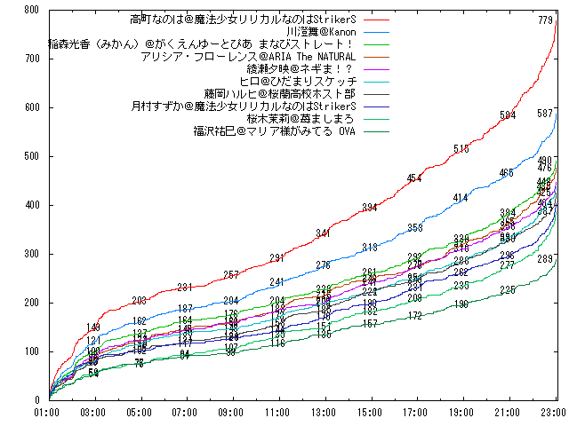 1位 779票 高町なのは@魔法少女リリカルなのはStrikerS 2位 587票 川澄舞@Kanon 3位 490票 稲森光香(みかん)@がくえんゆーとぴあ まなびストレート! 4位 476票 アリシア・フローレンス@ARIA The NATURAL 5位 448票 綾瀬夕映@ネギま!? 6位 438票 ヒロ@ひだまりスケッチ 7位 425票 藤岡ハルヒ@桜蘭高校ホスト部 8位 404票 月村すずか@魔法少女リリカルなのはStrikerS ━━━━━ここまで本戦進出━━━━━ 9位 387票 桜木茉莉@苺ましまろ 10位 289票 福沢祐巳@マリア様がみてる OVA 11位 286票 ナツキ・クルーガー@舞−乙HiME Zwei 12位 262票 弥海砂@DEATH NOTE 13位 246票 小牧郁乃@OVA ToHeart2 14位 234票 島津由乃@マリア様がみてる OVA 15位 227票 カミナギ・リョーコ(守凪了子)@ZEGAPAIN 16位 211票 鷹野三四@ひぐらしのなく頃に 16位 211票 ソルティ・レヴァント@SoltyRei 18位 204票 ミルロ@ふしぎ星の☆ふたご姫Gyu! 19位 201票 ウルトリィ@うたわれるもの 20位 197票 ファイン@ふしぎ星の☆ふたご姫Gyu! 21位 185票 白鳥空@京四郎と永遠の空 22位 178票 神凪綾乃@風の聖痕 23位 165票 デ・ジ・キャラット(でじこ)@ウィンターガーデン 23位 165票 ドミヌーラ@シムーン 25位 164票 磯野フネ@サザエさん 26位 156票 エミリィ@奏光のストレイン 27位 154票 三浦茜@ロケットガール 27位 154票 フランシスカ@怪物王女 29位 151票 神泉やす菜@かしまし 〜ガール・ミーツ・ガール〜 30位 144票 鳴滝風香@ネギま!? 30位 144票 トモエ・マルグリット@舞−乙HiME Zwei 32位 128票 神田百合奈@結界師 ━━━━ここまで2次予選進出━━━━ 33位 126票 猿飛あやめ(さっちゃん)@銀魂 33位 126票 秋月律子@アイドルマスター XENOGLOSSIA 35位 119票 武嶋蔦子@マリア様がみてる OVA 35位 119票 七村秋菜@円盤皇女ワるきゅーレ 時と夢と銀河の宴 37位 116票 大家さん@ひだまりスケッチ 38位 103票 ウーノ@魔法少女リリカルなのはStrikerS 38位 103票 鷲峰雪緒@BLACK LAGOON The Second Barrage 40位 94票 日向ひまわり@ひまわりっ!! 41位 86票 小日向音羽@はぴねす! 42位 73票 グランマ@ARIA The NATURAL 43位 67票 吉岡チエ(よっち)@OVA ToHeart2 44位 66票 高田清美@DEATH NOTE 45位 65票 愛川桃@ときめきメモリアル Only Love 45位 65票 柏瞳@N・H・Kにようこそ! 45位 65票 ユキノ・クリサント@舞−乙HiME Zwei 48位 64票 中原スナコ@ヤマトナデシコ七変化 49位 62票 時野リカ@円盤皇女ワるきゅーレ 時と夢と銀河の宴 50位 61票 涼宮ハルヒのコスプレをした女の子@らき☆すた 51位 60票 西澤桜華@ケロロ軍曹 52位 58票 ティアナ@風の聖痕 53位 54票 星野(茂野)桃子@MAJOR 3rd season 54位 53票 ミコト@舞−乙HiME Zwei 55位 50票 摩利あゆき@かしまし 〜ガール・ミーツ・ガール〜 56位 46票 松崎綾子@ゴーストハント 57位 45票 リリィ・C・シャーベット@ギャラクシーエンジェる〜ん 57位 45票 アリサ=サザンクロス@ケロロ軍曹 59位 42票 高峰ゆずは@はぴねす! 60位 39票 三木清良@のだめカンタービレ 60位 39票 響ミソラ@流星のロックマン 60位 39票 セレナ@銀色のオリンシス 63位 35票 インテグラル・ファルブルケ・ウィンゲーツ・ヘルシング@HELLSING 64位 34票 アイコ@電脳コイル 64位 34票 しきみ@ひまわりっ!! 66位 33票 アネーシャ・オル・メガーラ@ヒロイック・エイジ 67位 30票 式守那津音@はぴねす! 68位 29票 食堂のおばちゃん@忍たま乱太郎 69位 28票 シャトン@MAR-メルヘヴン- 70位 26票 司馬懿仲達@一騎当千 〜Dragon Destiny〜 70位 26票 つばさ@ながされて藍蘭島 72位 25票 アーク・アヴニール@ZEGAPAIN 73位 24票 チュニャン@ツバサ・クロニクル シリーズ 74位 22票 つぐみ・ローゼンマイヤー@創星のアクエリオン−裏切りの翼− 75位 21票 すずらん(すずの母)@ながされて藍蘭島 76位 20票 胡蝶すずめ@桃華月憚 77位 19票 レナの母@ひぐらしのなく頃に 78位 17票 白姫味菜子(白鳥ミーナ)@月面兎兵器ミーナ 79位 16票 鈴木綾音@MAJOR 3rd season 80位 13票 ゲソ美@大魔法峠 80位 13票 巡の取り巻き@瀬戸の花嫁 80位 13票 フィーリア王女@ふたりはプリキュア Splash Star 80位 13票 三善由衣子@のだめカンタービレ 80位 13票 イゾラ@ZEGAPAIN 85位 12票 庄司恵@金色のコルダ 〜primo passo〜 85位 12票 鬼怒川綾乃@スクールランブル 二学期 87位 11票 レベッカ@牙 -KIBA- 87位 11票 シスター・サンプリス@レ・ミゼラブル 少女コゼット 87位 11票 保科直美@ときめきメモリアル Only Love 87位 11票 あい@どうぶつの森 87位 11票 夏木あい@Yes!プリキュア5 87位 11票 ヨランダ@BLACK LAGOON The Second Barrage 87位 11票 ゾラ@BLUE DRAGON 87位 11票 繭子@xxxHOLiC 95位 10票 萩乃柚留@蜜×蜜ドロップス 95位 10票 月野小夜子@ゲゲゲの鬼太郎 95位 10票 吉野杏里@サクラ大戦ニューヨーク・紐育 95位 10票 ラーラ@スクールランブル 二学期 95位 10票 烏丸妃路@かみちゃまかりん 100位 9票 浜坂瑞枝(シスター浜坂)@ストロベリー・パニック 101位 8票 エイミー@爆裂天使〜インフィニティ〜 101位 8票 川上由乃@_summer 101位 8票 愛子@ウィンターガーデン 101位 8票 公園の霊@ゴーストハント 101位 8票 ショコラ@ワンワンセレプー それゆけ!徹之進 106位 7票 久保千鶴@ストラトス・フォー アドヴァンス 完結編 106位 7票 マリオン@カレイドスター ぐっどだよ!ぐぅーっど! 106位 7票 