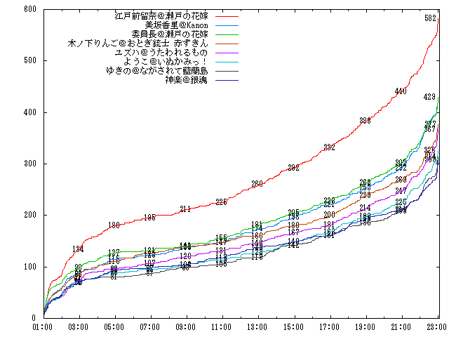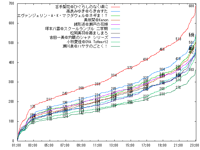 1位 688票 古手梨花@ひぐらしのなく頃に 2位 543票 高良みゆき@らき☆すた 3位 536票 エヴァンジェリン・A・K・マクダウェル@ネギま!? 4位 501票 美坂栞@Kanon 5位 479票 銭形巡@瀬戸の花嫁 6位 477票 塚本八雲@スクールランブル 二学期 7位 470票 松岡美羽@苺ましまろ 8位 468票 吉田一美@灼眼のシャナ シリーズ ━━━━━ここまで本戦進出━━━━━ 9位 452票 小牧愛佳@OVA ToHeart2 10位 363票 瀬川泉@ハヤテのごとく! 11位 345票 十条紫苑@乙女はお姉さまに恋してる 12位 275票 神河繭子@sola 13位 260票 時雨亜沙@SHUFFLE! MEMORIES 14位 252票 久寿川ささら@OVA ToHeart2 15位 221票 レイン@ふしぎ星の☆ふたご姫Gyu! 16位 213票 上原むつき(むっちー)@がくえんゆーとぴあ まなびストレート! 17位 198票 高槻やよい@アイドルマスター XENOGLOSSIA 18位 195票 リンディ・ハラオウン@魔法少女リリカルなのはStrikerS 19位 180票 小此木優子(ヤサコ)@電脳コイル 20位 179票 ゆうま@錬金3級まじかる?ぽか〜ん 21位 178票 瀬戸蓮@瀬戸の花嫁 22位 173票 花菱美希@ハヤテのごとく! 23位 149票 ミント・ブラマンシュ@ギャラクシーエンジェる〜ん 23位 149票 大河内アキラ@ネギま!? 25位 143票 ヴァルダ@キスダム -ENGAGE planet- 26位 137票 孫策伯符@一騎当千 〜Dragon Destiny〜 27位 134票 田村ひより@らき☆すた 28位 127票 井上織姫@BLEACH 29位 118票 ヴァニラ・H@ギャラクシーエンジェる〜ん 30位 113票 プレシア・テスタロッサ@魔法少女リリカルなのはStrikerS 31位 111票 ツゲ・ユフィンリー@神曲奏界ポリフォニカ 32位 107票 ヴァラール@キスダム -ENGAGE planet- ━━━━ここまで2次予選進出━━━━ 33位 96票 きみどり@妖逆門 34位 92票 霧夜エリカ@つよきす Cool×Sweet 35位 89票 雨童女@xxxHOLiC 36位 88票 山田薫子@くじびきアンバランス 37位 71票 志乃@.hack//Roots 38位 63票 暁の母@ARIA The NATURAL 39位 60票 セラス・ヴィクトリア@HELLSING 40位 57票 タビー@.hack//Roots 41位 54票 野山野林檎(リンゴ)@エア・ギア 42位 53票 ミレイの事が好きだと頬を赤らめレズビアンカミングアウトした女生徒@コードギアス 反逆のルルーシュ 43位 52票 竜崎桜乃@テニスの王子様 Original Video Animation 全国大会篇 Semifinal 44位 50票 水島紀子@ストロベリー・パニック 45位 48票 アクセラ・ウォリック@SoltyRei 46位 45票 マイメロママ@おねがいマイメロディ シリーズ 47位 42票 山田ミチル(ちゃる)@OVA ToHeart2 48位 41票 瀧鈴音@アイシールド21 49位 40票 佐々木祐理花@ラブゲッCHU ミラクル声優白書 49位 40票 チャル@サルゲッチュ 〜オンエアー〜 シリーズ 51位 38票 六条章子@桃華月憚 51位 38票 藤川優花@ときめきメモリアル Only Love 53位 37票 XIのカプセルの中の女の子@魔法少女リリカルなのはStrikerS 54位 34票 XIIIのカプセルの中の女の子@魔法少女リリカルなのはStrikerS 54位 34票 芹沢美宇@となグラ! 56位 33票 ニャン美ちゃん@増田こうすけ劇場 ギャグマンガ日和 第2弾 57位 32票 てんそう@いぬかみっ! 58位 29票 大門知香@デジモンセイバーズ 59位 26票 小倉エリナ@きらりん☆レボリューション 60位 25票 田中エスメラルダ@大魔法峠 60位 25票 ジュナ(真名姫)@桃華月憚 60位 25票 七瀬留美に似た女の子@Kanon 60位 25票 霧生薫@ふたりはプリキュア Splash Star 64位 24票 フウ@桃華月憚 65位 23票 ソフィア@CLAYMORE 66位 22票 星井ラミカ@らき☆すた 66位 22票 波多野小奈美@_summer 66位 22票 神山ビーナス(ママさん)@神様家族 66位 22票 ミルキー@ふしぎ星の☆ふたご姫Gyu! 66位 22票 榎本忍@くじびきアンバランス 66位 22票 ポヨンちゃん@ケロロ軍曹 72位 21票 さよか@いぬかみっ! 72位 21票 シャイン・ハウゼン@スーパーロボット大戦OG 〜ディバイン・ウォーズ〜 72位 21票 イレーヌ@BLOOD+ 75位 20票 後刀美弥@ケータイ少女 75位 20票 満月美夜子@ドラえもん のび太の新魔界大冒険 〜7人の魔法使い〜 77位 18票 キサラ@シムーン 77位 18票 神山美佐@神様家族 77位 18票 ミランダ・ロットー@D.Gray-man 77位 18票 長澤玲@らぶドル 〜Lovely Idol〜 81位 17票 福沢みき@マリア様がみてる OVA 81位 17票 イルゼ・バーンリ@風の少女エミリー 81位 17票 アクーネ@スパイダーライダーズ シリーズ 84位 16票 霧沢あおい@きらりん☆レボリューション 84位 16票 楊豆花@つよきす Cool×Sweet 84位 16票 ブラック学園長(ホワイト学園長)@ふしぎ星の☆ふたご姫Gyu! 87位 15票 島津若菜@_summer 87位 15票 ヨウコ・ヘレネ@舞−乙HiME Zwei 87位 15票 キュキュ@ふしぎ星の☆ふたご姫Gyu! 87位 15票 桜井小蒔@東京魔人學園剣風帖 龍龍(トウ) 87位 15票 ケリー・ストウナー@英國戀物語エマ 第二幕 87位 15票 王理花@Darker than BLACK -黒の契約者- 93位 14票 ペネロペ@うっかりペネロペ 93位 14票 御厨アリス(テイトク)@ストラトス・フォー アドヴァンス 完結編 95位 13票 羊頭狗肉の意味を調べた5-2の生徒@苺ましまろ 95位 13票 トロワ@ふしぎ星の☆ふたご姫Gyu! 95位 13票 篠田千晶@Darker than BLACK -黒の契約者- 98位 12票 上原美里@NANA 98位 12票 タチバナ・ミズキ@ZEGAPAIN 98位 12票 ハピナス@ポケットモンスター シリーズ 98位 12票 早川さん@サザエさん 98位 12票 早乙女レイ@遊戯王 デュエルモンスターズ GX 103位 11票 アリス・イヴ@BLACK BLOOD BROTHERS