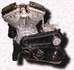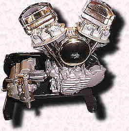 ハーレーの1948年型パンヘッド、エンジン模型です。航空エンジンの技術を応用した画期的な新世代エンジンとして注目を浴びたモデルです。 1/6スケールのこの模型は、320点の金属パーツで構成されている完全キットを組み上げたもの。シリンダーやクランク、ギアボックスまで忠実に再現されていて、エンジン下のクランクを回すと駆動系のギアやチェーンが回り、ピストンも"カタカタ"と動作します。 非常に面白いキットです。1/6ですから当然ネジやギアーも極小なので、まるでカメラを組んでいる様な感覚で製作できます。駆動系のチェーンまで1/6だったのには驚きました。 |