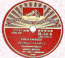 ビクターの家庭音楽名盤集、第2巻になるとSPは12インチの大盤に変ります。アルバム自体も当然大きく、大変綺麗な皮張り(ピッグ)が施されていました。詳しい曲の解説書も付いていて、しかも当時の演奏者の大きなブロマイド付き。1巻と同じ中流家庭向きとありますが、これは非常に豪華なアルバムだと思います。収められている曲も豪華で、ピアノ王と呼ばれポーランド初代大統領でもあったパデレフスキーの夜想曲や、エルマン(バイオリン)のセレナード、近衛秀磨(音楽家)の越天楽など当時の世界的に有名な音楽家が勢揃いで、このレコードの為に演奏された様です。 収録曲は次の通り、大人向きのシックな独奏曲が多いですね。僕のお気に入り!! 日本Victor 1,A:歌劇-フィガロノ婚礼-序曲 B:歌劇-コシ・ファン・ウッテ-序曲 (ブッシュ*指揮) 2,A:奏鳴曲-ヘ調 B:夜想曲 (ピアティゴルスキー*ピアノ) 3,A:ウィーン狂想曲 B:支那の小鼓 (クライスラー*バイオリン) 4,A:カンッォネッタ B:ヴィヴイォ・エ・エネルヂコ ( セコヴィア*ギター) 5,A:B:ハンガリー狂詩曲-第二 (ストコフスキー*指揮) 6,A:B:四重奏曲-ニ短調-死と少女 (ブッシュ*指揮) 7,A:モスコーの憶ひ出 B:セレナード (エルマン*バイオリン) 8,A:ユダスマカボイス B:ローレライ-アヴェマリア (オックス*指揮) 9,A:越天楽 (オーケストラ) B:三つのオレンジの恋 (ストコフスキー*指揮) 10,A:ミニュエット - ト長調 B:夜想曲 - 変ヘ長調 (パデレフスキー*ピアノ) 11,A:Ave Maria B:Air For G String G線上のアリア (エルマン*バイオリン) 12,A:コール・ニドライ B:前奏曲 (カサルス*チェロ) ↑赤色でリンクされている曲は 最後まで聴く事ができますよ。 |
