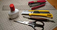 ■01 用意する物は、はさみ、カッターナイフ、定規、ホチキス、ピンセット、それと折り目を付けるためのへらの様なもの。 画像ではボンドがありますが、特にのりやボンドは使わなくても作れます。 |