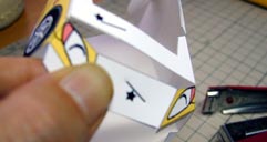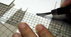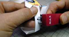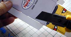| 光沢紙は印刷面でゴシゴシこするとプリントを傷めるので裏からゴシゴシ折り目付けを行います。でも裏からは折れ線がどこにあるか分かりません。そこで、表側から折れ線の紙の縁にカッターでほんの少し切り込みを付けておきます。 | |||||||||||||||||||||||||||||||||||||||||