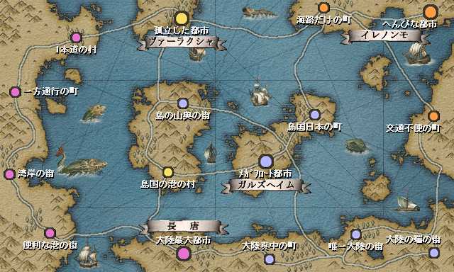 全体的に海しかない世界、創ってから後悔の連続、しかも首都は変な場所に・・・後は特にコレと言った特徴もなし、精霊も地方最強もでてないし・・・・・( ̄。 ̄ )ボソ