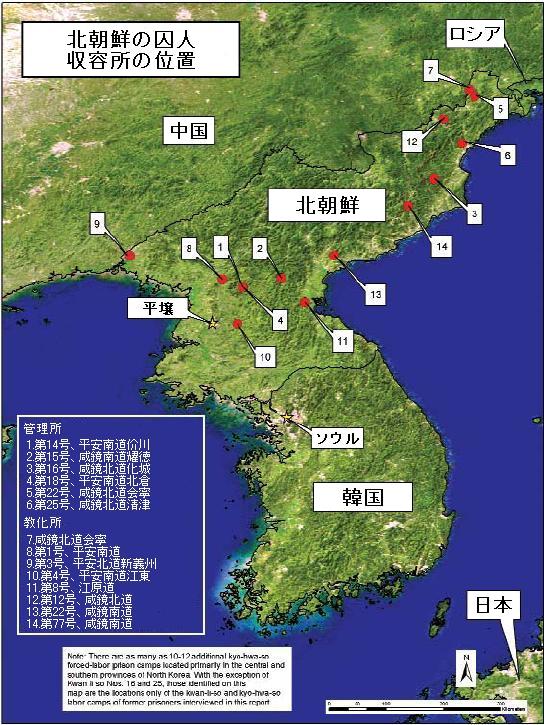 注意:主として北朝鮮の中央及び南部道に位置する追加10〜12ヶ所程度の教化所が存在する。第15及び第25管理所を除き、この地図上で確認されるものは、この報告書でインタビューを受けた元収容者の管理所及び教化所のみの位置である。