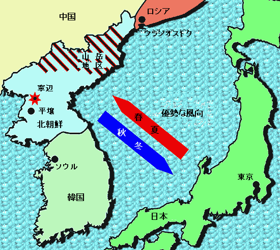 米国が夏の終わりまでに北朝鮮に対して武力作戦に着手すれば、ロシアと中国は、いわゆる放射線汚染の中に完全に入り得る。問題は、ロシア連邦気象センター世界都市・国家担当当直予報官タイムラズ・イワニゼによれば、8月、北朝鮮では南東(言い換えれば、海から陸地へ)の風が優勢なことにある。その上、北朝鮮領土上空では、風向の北西及び北への転換が直接起こる。風配図の変化の移行期は、9月である。9月、北朝鮮上空では、主として、陸地から海に(北西から南東に)風が吹いた後、南西に転換する。10月、北西の風が安定して優勢となる。言い換えれば、秋、韓国と日本が汚染地帯に入る。