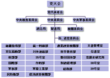 組織及び運営体系を見てみれば、朝鮮労働党は、民主主義中央集権制の原則により組織され、民主主義を標榜しているように見えるが、全ての党組織は、党中央委員会に絶対服従するようにされており、1党独裁体制である。党の下部機関は、道(直轄市)・市(区域)・郡のみならず、軍隊内にまで構成されている。