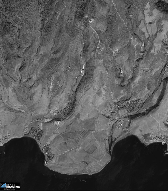 北朝鮮大浦洞のこの解像度1mの白黒画像は、1999年11月1日にSpace Imaging社のIKONOS衛星により収集された。画像は、大浦洞ミサイル施設を写している。