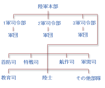 陸軍の部隊構造は、1、2、3野戦軍司令部と首都防衛司令部、特殊戦司令部、航空作戦司令部、軍需支援司令部、教育司令部、陸軍士官学校及びその他陸軍直轄部隊で編成 | |