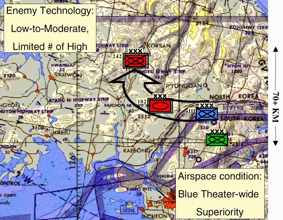 米韓の防衛計画は、脅威だけではなく、山岳地形によっても方向付けられる。朝鮮は、一般に、機動地上戦も、重爆撃も招来しない錯雑した歩兵地形と評価されているが、北朝鮮は、突破を利用するのに決定的な大装甲部隊を集結させており、これら部隊は、米空軍力の潜在的な撃破地帯である狭い回廊を通過する。米韓軍は、ソウル防衛を狙いとした力強い前方防衛を実行する。その戦役は、歩兵、砲兵、及び機甲兵で遂行される諸兵科連合地上戦闘が支配する。米空軍と海軍は、近接航空支援、阻止、及び縦深打撃任務を実行する。第1段階後、第2段階における米韓の作戦は、恐らく、緊要地形の奪取、敵部隊に対する追加打撃、及び事後の攻撃の撃退に焦点を当てている。第3段階は、米地上部隊の集結が完了し、韓国軍が補充されたときに始まり、韓国国境の回復と北朝鮮の軍事力の撃破を狙った強力な反攻である。