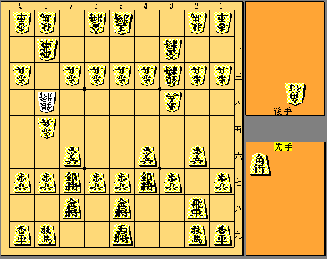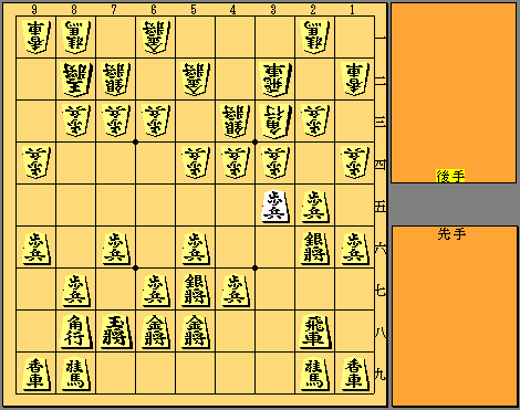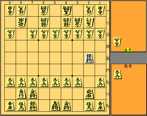 この戦型は「相掛かり(あいがかり)」といわれている戦型での棒銀です。 相掛かりとは一般に意お互いの飛車先を交換する戦型を指します。 飛車と銀が棒のように一直線になることから「棒銀」の名がついています。 この戦型での棒銀は「将棋学校 棒銀対策@」で紹介したように、 簡単に受かります。これは「角頭をやぶる」という棒銀戦法の狙いが単純なためです。 そのためにプロでは▲2六銀と出ずに▲3六銀と出て相手の指し手を制限する目的で 指すのが一般的です。
