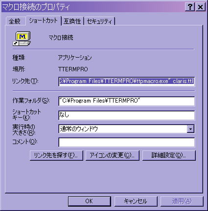 ネットワーク経由で、unixやlinuxを使用するには、色々な方法がありますが、私は、Telnet等のツールを使用して接続しています。 この場合、X windowは、使用できませんがある程度の操作は、テキストモードの入力で行えます。 windows等を使用する場合は、DOS窓からtelnet <ipアドレス>等と入力するとターミナル(telnet)が起動します。 私の場合、使い勝手の良いTera Term Proを使用しています。 このTera Term Proには、マクロ機能があり、Telnet使用時のIPアドレスの入力や、ユーザー名/パスワードの入力等もマクロに登録しておけば、必要最小限のオペレーションですばやく目的のサーバーに接続できます。 Tera Term Proのマクロは、テキスト形式で事前に準備する必要があります。 マクロの記述方法は、Tera Term ProのHelpに記述されていますので、参照して下さい。 また、私自身か使用しているマクロの例(サンプル)としては、こちらを参照して下さい。 私自身、Helpを参照して作成したので、これ以上の事は分かりませんが。。。 マクロを起動するには、Tera Term Proがインストールされたホルダにttpmacro.exeが存在しています。 これを起動すると、実行したいマクロファイルを選択することが出来ます。 また、毎回マクロファイルを選択するのが面倒な場合は、シュートカットに事前に登録しておくと良いでしょう。 ショートカットの作成としては、ttpmacro.exeのショートカットをディスクトップ上等に一旦作成します。 作成したショートカットを右クリックでプロパティーを開きます。 プロパティーには、リンク先と言う項目があるので、ttpmacro.exeの記述の後に、実行したいマクロファイルの定義をしておきます。 設定例としては、 ![]() と、こんな感じです。
