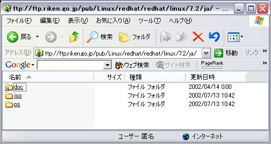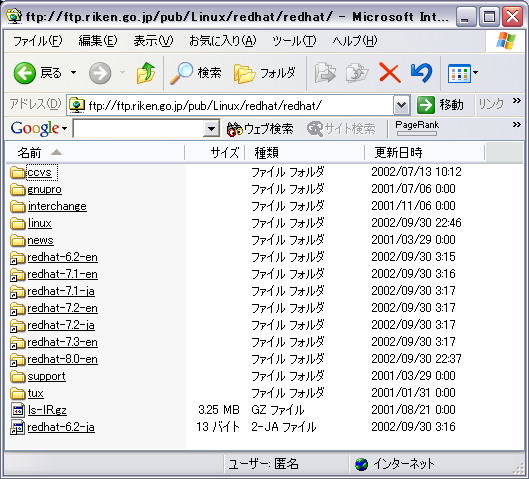 LinuxやSolaris8等の入手が、困難な場合直接サイトからFTPでインストールファイルをダウンロードしてくる方法があります。 ダウンロードしたファイルは、CD-ROM等に焼くことによって、インストールCD-ROMとすることも出来ます。 ここでは、RedHatを例にとり、ダウンロードからインストールCD-ROMの作成までを説明します。 RedHatのダウンロードについては、こちらに記述されていますが、インストールCD-ROM作成に馴染みが無い方は、「これって、一体・・・」と思うことでしょう。 事実、私もその一人でしたから・・・(笑) RedHatのファイルをダウンロードするには、こちら(ミラーサイト)から入る事になるでしょう。 このページには、RedHatとVine Linuxが上段と下段に分かれています。 RedHatのダウンロードは、上段のサイト何れかのリンクを辿っていきます。 この時、Host欄が5行から成り立っています。何れも目的のファイルにたどり着くと思いますが、FTPの記述があるサイトは、FTPでのダウンロード、以外はHTTPでのダウンロードとなります。 RedHat等のアップデートモジュールをダウンロードするには、Updatesの欄のいづれかから。ツールなどをダウンロードする場合は、Contrib/powertoolsの欄の何れかを選択します。 今回は、インストールCD-ROMを作成する目的なので、Red Hat Linux欄の何れかをクリックします。 今回は、/pub/Linux/redhat を選択します。 上記のRedHat Linux 欄のftp.riken.go.jp行を選択すると、以下の様な画面に変わります。 (下記の画面をクリックすると大きくなります) インストールCD-ROMの為に、Red Hat Linux欄を選択したのに、何故ここで、updatesフォルダがあるかは不明です(笑) Redhatフォルダをクリックします。 クリック後は、以下の様な画面になります (該当画面をクリックすると拡大します) RedHatのバージョンは、6.2から8.0まであります。 ご自分の使用したいバージョンをクリックします。 今回は、RedHat7.2を選択します。 RedHat7.2には、ファイル名の一部にjaと言う記述とenの記述の二つがあります。厳密に何が違うかは不明ですが、ja=japaneseの略と判断し、redhat-7.2-jaをクリックします。 (該当画面をクリックすると拡大します) 今回は、ISOイメージファイルからインストールCD-ROMを作成するので、ISOフォルダをクリックします。 その次のi386フォルダを更にクリックします。 その後、以下の様なファイル一覧が表示されます。 (該当画面をクリックすると拡大します) RedHatのダウンロードファイルは、以下の命名規約によって、ファイル名が決まっているようです。(独断の推測) 開発コード-ファイル形式-ディスク番号.iso 開発コードは、RedHatのバージョンを表します(除く6.2)。 と、こんな感じでファイル名を見ることで、バージョンが分かります。RedHat6.2は、ファイルの一部にそのまま、バージョンが含まれています。 ファイル形式は、パッケージタイプかバイナリータイプがあります。 i386に関しては、一般的には、Intel系のCPU用の名前です。 ディスク番号は、インストールする時の適用番号を表します。 今回、RedHat7.2をダウンロードするにあたって、以下の二つのファイルをダウンロードしてきました。 enigma-i386-disc1.iso enigma-i386-disc2.iso 上記二つのファイルをダウンロードした後、今度は、CD-ROMに該当のイメージファイルを焼くことにします。 ここでの"焼く"とは、ファイルをCD-ROMにコピーする事です。 ここで重要なのは、ISO形式のファイルである。と、言うことです。 何故、重要かと言うと、今ダウンロードしてきたファイルは、二つです。それぞれdisk1/2となっているので、上記のファイル名規約(推測)からCD-ROMは二枚必要。と、言うことが分かります。 ですが、ダウンロードしたファイルも上記のファイル名のままです。通常インストールCD-ROMの中身を見てみてると、色々なフォルダやファイルがあるのですが、現状では二つだけ・・・ この疑問を解決しているのがISO形式のファイルなのです。 (ISO形式のファイルは、イメージファイルとも言われます) CD-R に焼くための詳細については、ハードウェア・ソフトウェアに付属のマニュアルを参照して下さい。 ご注意 ISO形式のファイルコピーに対応したライターソフトであれば、焼かれたCD-ROMの中には、ISO形式が展開されたファイルが格納されます。 この展開されたファイルがインストールCD-ROMとなります。 逆に言うと、CD-ROMにコピーした後、ファイル名が、.iso形式のままの場合、正しく焼かれていない事を表します。 |