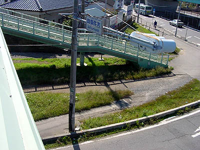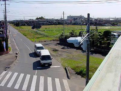 桜土浦で下りて、R354号、県201号、県25号、で阿見住吉の六差路交差点へ。 ここは荒川沖駅から自衛隊専用の貨物線路が来て2手に別れていた場所です。 歩道橋の脇にはバラストみたいな砂利も残り線路跡が判ります。