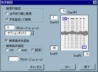 ・したがってどの列のデ−タを検索するか、列指定が必要(Z列までで小文字入力も可)