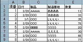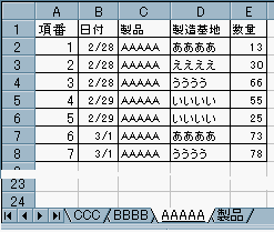 下記説明は、上図の製品列を指定し[AAA][BBB]等の製品別にシート化した場合。