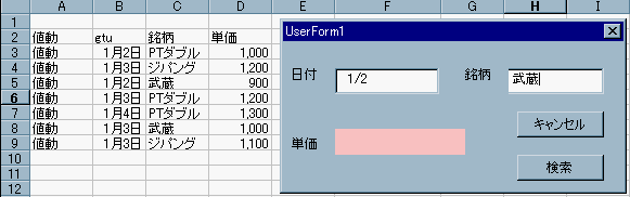 そこから検索して、C列のデータを探して、ユーザーフォーム上の