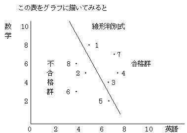合格した群(1・3・4・7)と不合格の群(2・5・6・8)を区分わけする直線を1本考える。