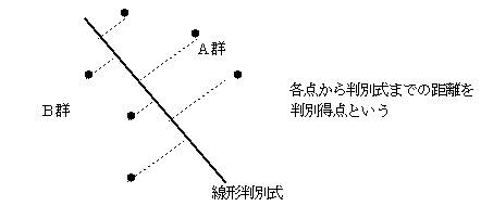 判別得点は、各標本データ点から判別式までの距離で表される。