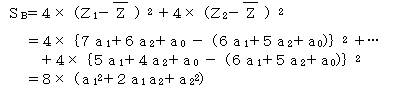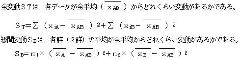 級間変動SBは、A群の平均が全平均からどの位散らばっているかと、B群の平均が全平均からどの位散らばっているかを合計したものである。