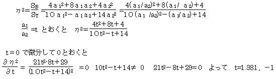 t=1.381,−1 で相関比η2は最大値または最小値を持つ。このtの値を相関比η2に代入するとt=−1の時 η2=0 となり最小となる。t=1.381の時 η2=0.71556 となり最大となる。つまり相関比η2は、a1÷a2=−1の時最小となり、a1÷a2=1.381の時最大となる。いま求めようとしているのは、相関比η2を最大とするa1・a2であるから、1.381を採用する。