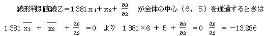 これより求める線形判別式は、Z=1.381x1+x2−13.286 となる。この線形判別式を使用することにより、データを2群に分けることができる。