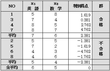 いま、A中学校の8人の生徒の英語(x1)と数学(x2)の評価があり、この8人の生徒がB高校を受験してその合否結果(Z)が分かっているとする。すると、ここに2つの母集団、合格群と不合格群があることになる。