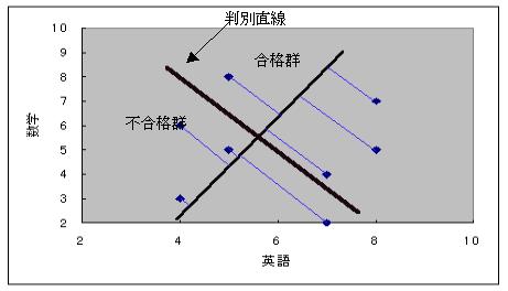 判別直線を境にして、右側に合格群、左側に不合格群があることが分かる。