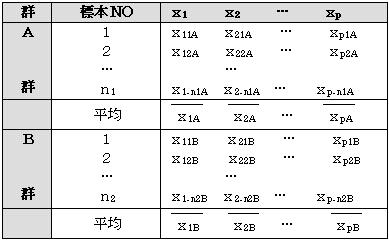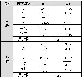 2群の多変量データが下の表のようにあるとすると