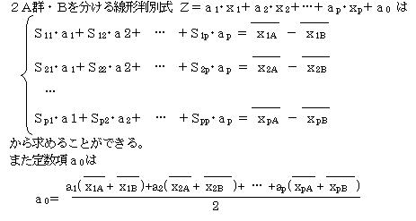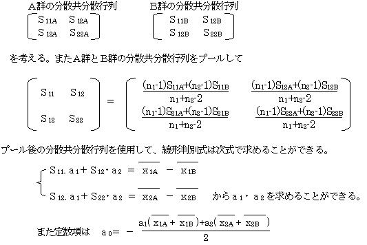 Z=a1・x1+a2・x2+a0 を求めるのに分散共分散行列を利用して求める方法がある。いま説明変量がx1・x2と2つあり、A群・B群の2群に分かれている。