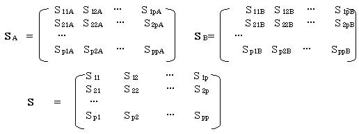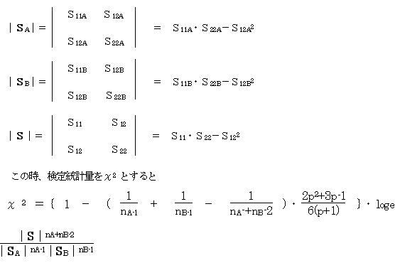 A群・B群のそれぞれの分散共分散行列をSA・SBとする。またSA・SBのプール後の分散共分散行列をSとすると
