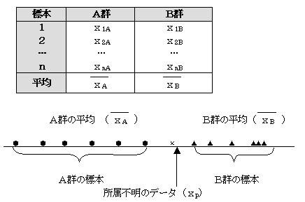 DA2<DB2 であればxpは、A群に近い。DA2>DB2であればxpは、B群に近い。