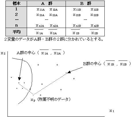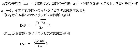マハラノビスの距離は、各群の中心からその標本への分散を考慮した距離を示すので、その標本はマハラノビス距離の小さい方の群に所属する標本であるとする。