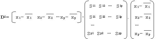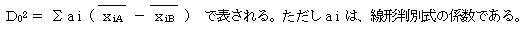 標本が2A群・Bに分かれており、その説明変量がp個ある時、A群の説明変量の平均をx1A・x2A…xpA、またB群の説明変量の平均をx1B・x2B…xpB とする。この時、A群の中心からB群への中心へのマハラノビスの距離D02 は