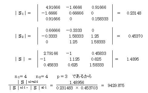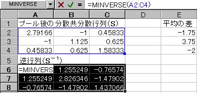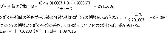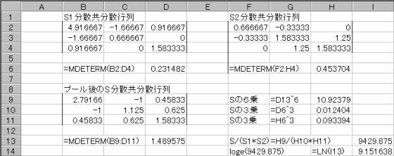 群1(A業界社員)の分散共分散行列をS1、標本数をn1、群2(B業界社員)の分散共分散行列をS2、標本数をn2、またプールした分散共分散行列をS、変量数をpとすると
