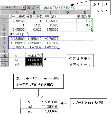 先頭の値を=MINVERSE(行列範囲)で求める。
