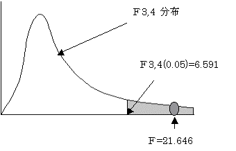 F>F3,4(0.05) であり、棄却域に入る。よって2群の母平均は等しいという仮説を棄却する。2群の母平均に差がある。