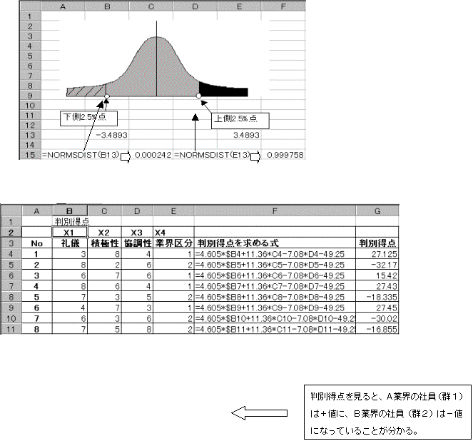 判別得点は、判別式 Y=4.605・X1+11.36・X2−7.08・X3−49.25 で求める。