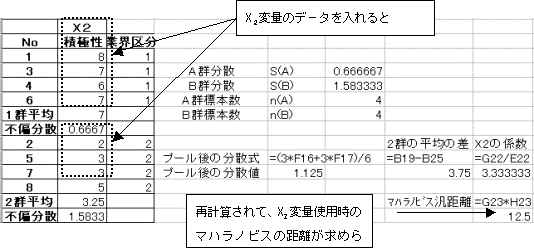変量X2を使用した線形判別式で、2群に判別したときの2群の中心間のマハラノビスの距離はD2 =12.5。変量X2とX1を使用した線形判別式で、2群に判別したときの2群の中心間のマハラノビスの距離は