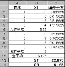 A群・B群の標本数はともに4である。これからプ−ル後の分散を求める。