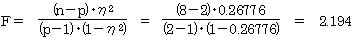 F=2.194の時の確率値は、=FDIST(F値、自由度1、自由度2)から求める。