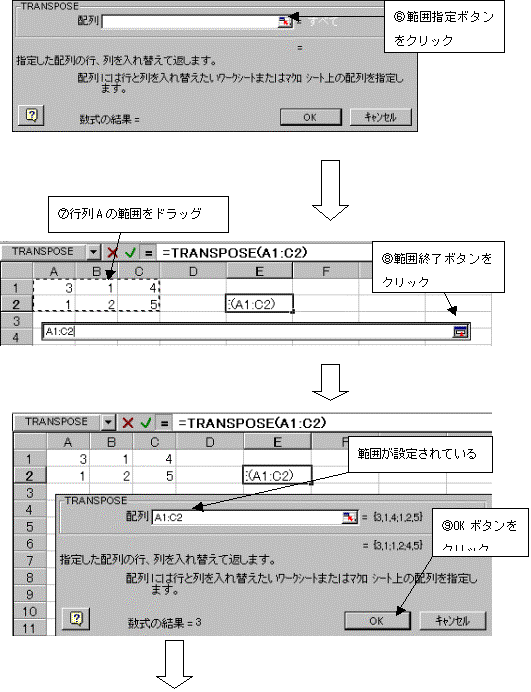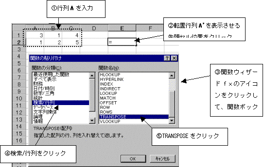 (4)TRANSPOSE関数で、転置行列を求めたい行列の範囲を指定する。