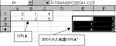転置行列は、元の行列を行・列を入れ替えるだけであるから、目で見ながら直接数値を入力してもよいが、間違って入力することや、元の行列の値を変更した時に再度目で見ながら訂正入力しなければならない。このTRANSPOSE関数を使用しておけば、間違いはないし、元の行列の値を変更すると、それに応じて自動的に再計算されて、正しい値となる。