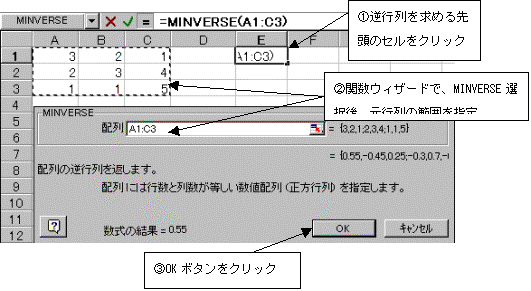 逆行列を求める関数:=MINVERSE(行列範囲)を使用すれば簡単に求められる。操作方法は、転置行列の時と同じ方法で行う。