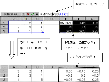 元行列Aが3行・3列であるから、逆行列も3行・3列分必要である。先頭のセル位置から3行3列分ドラッグし、次に数式バーをクリックし、CTRLキー+SHIFTキー+ENTERキーを押して展開する。