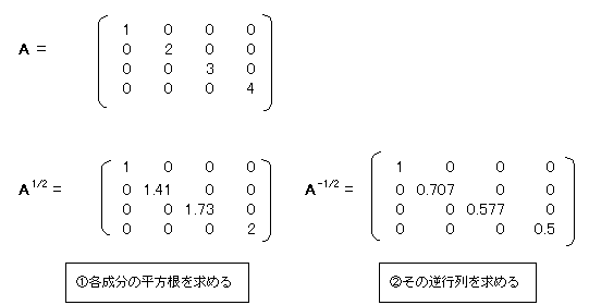 A-1/2 = (A1/2)‐1 であるから、A‐1/2を求めるには、最初に各成分の平方根を求め、続けてその逆行列を求めればよい。