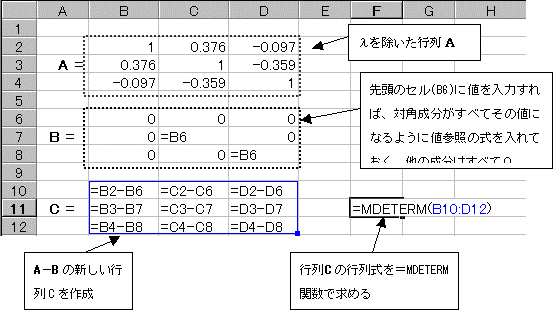 これを解くには、通常3次方程式を解かなければならないが、λを除いた行列Aと、対角成分がλからなる対角行列Bを作成し、A−Bの新しい行列Cを作成する。このCの行列式を関数で求めるようにしておく。最初は対角行列Bの各成分は0にしておき、対角成分の1行1列目に値を入力すると他の対角成分はすべてその値になるように参照式を入力しておく。