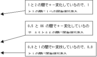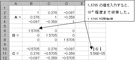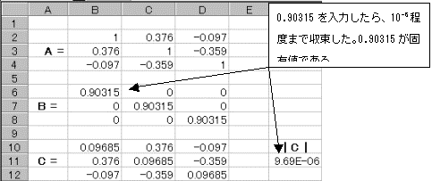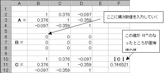 |C|の値を見ながら、セルB6に順次数値を入力していくとすぐに再計算されてその結果が|C|に表示される。|C|が+から−に変わるところを見つけ、|C|が10-5程度までの値となった時が固有値の値となる。この点は3つあるのでこの3点を探していく。